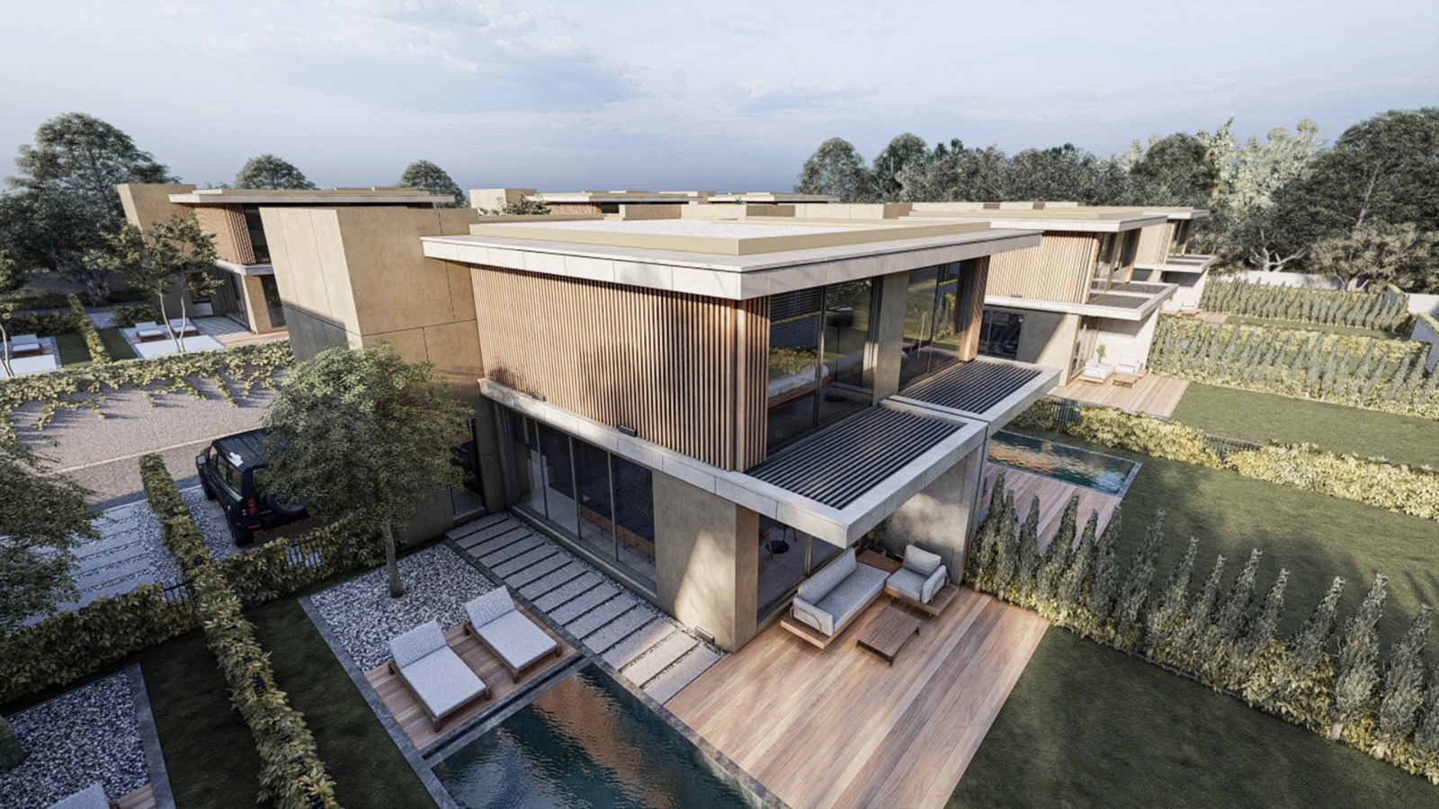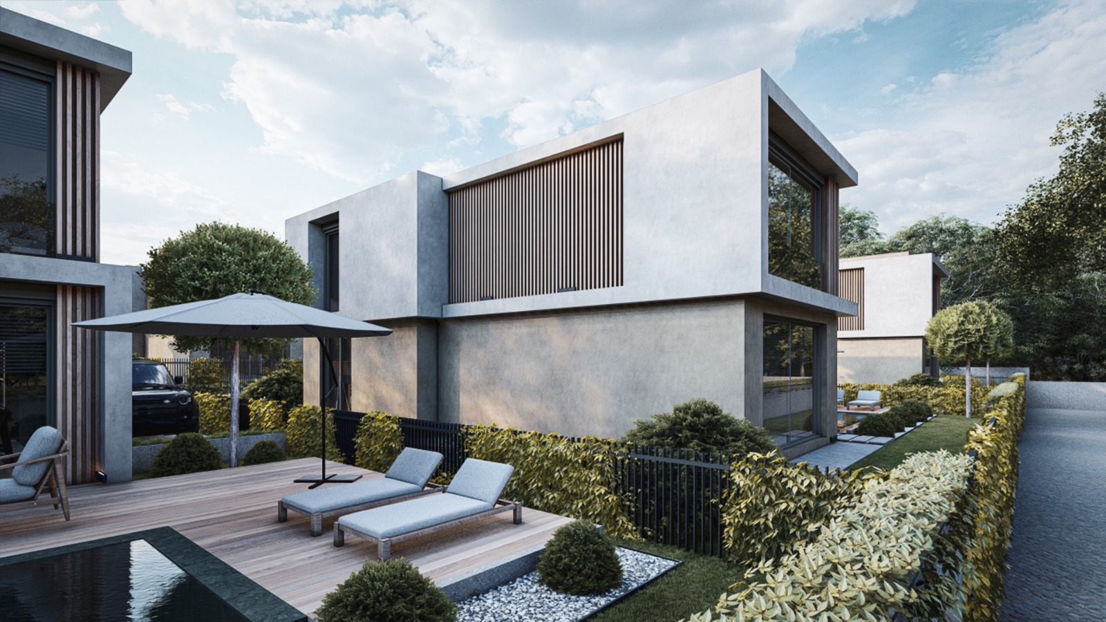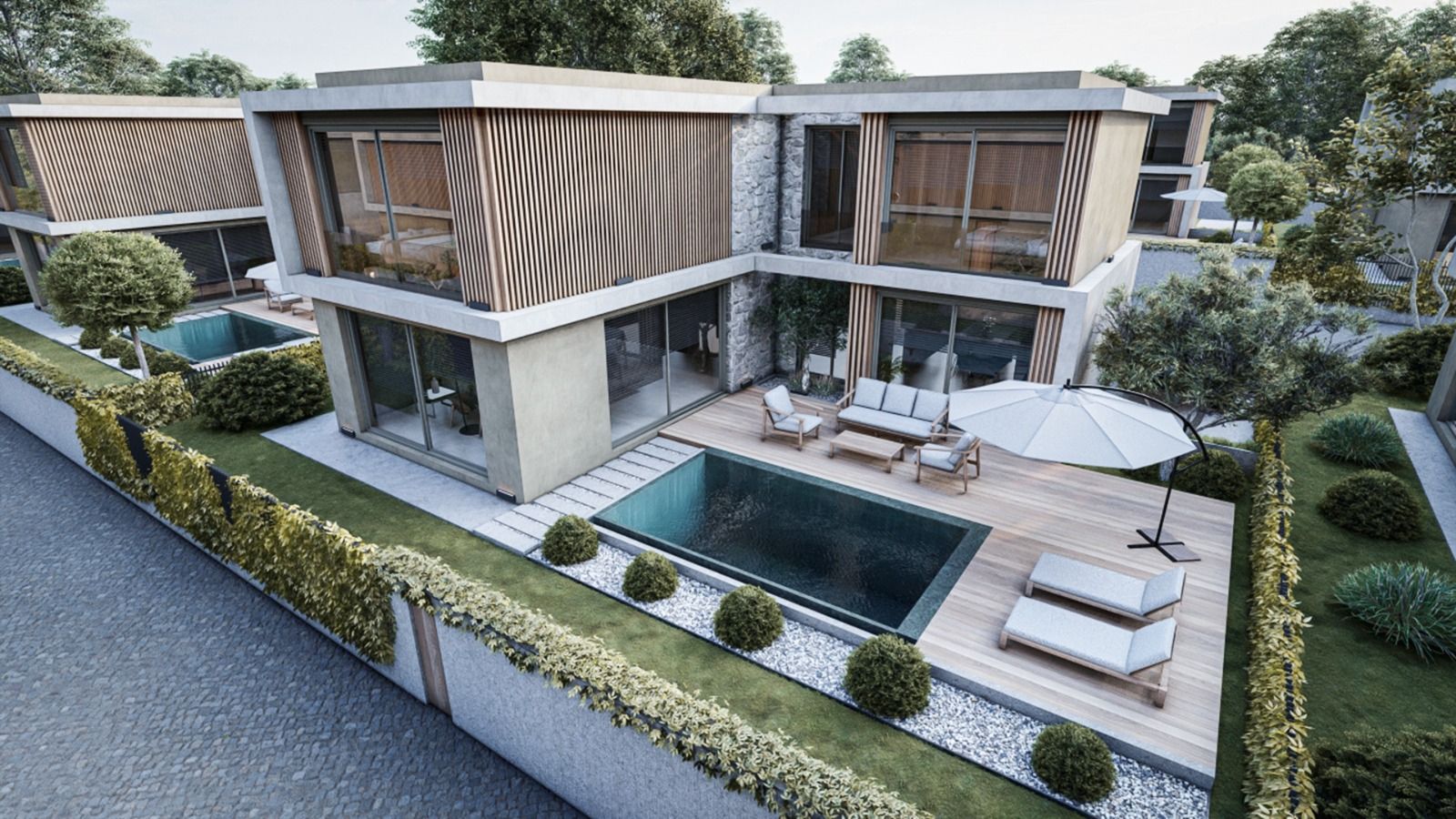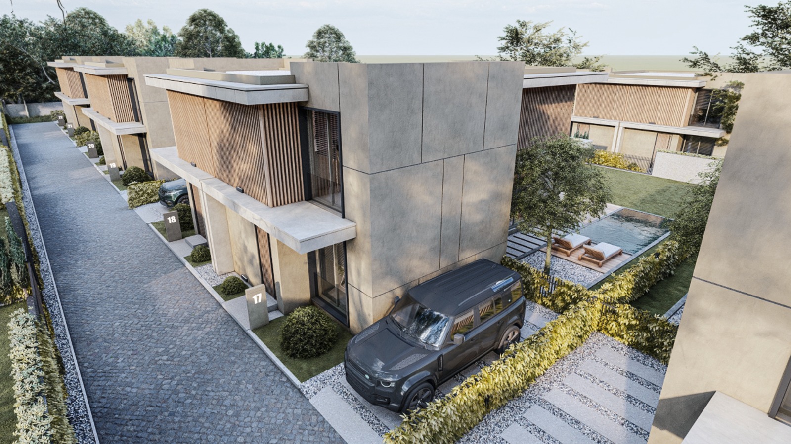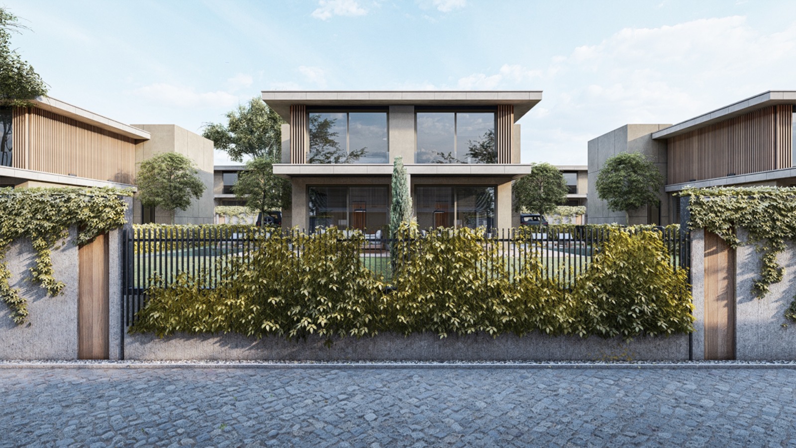 Gölyaka site projesi, Bursa’nın Orhangazi İlçesi İznik Gölü’ne kıyısı bulunan Gölyaka Köyü’nde konumlanmaktadır. 29.000 m²’lik araziye yayılan sitede 4 tipten oluşan 64 adet villa yer almaktadır. Her bir villa kendi içerisinde park alanı, bahçe ve havuz bulundurmaktadır. İznik Gölü manzarasına göre konumlanan villalar manzara yönelimine göre açılı olarak yerleştirilmiştir. L tip şeklinde tasarlanan villaların iç planlarında salon, mutfak ve havuz ilişkisine önem verilerek birbirleri ile olan entegrasyonu göz ününde bulundurulmuştur. Havuzlar manzara görecek şekilde ön cephede yer almaktadır. Dış cephede kullanılan doğal taş, ahşap ve açık bej tonlarının kullanımı projenin İznik iline ve tarihi dokusuna atıfta bulunmaktadır. Aynı zamanda duvarlarda doğal taş kullanımı ve ahşap strüktürlerle yeşil alanla uyum elde edilerek doğayla bütünleşen bir tasarım elde edilmiştir. Arazide bulunan kot farkı sayesinde her bir villa manzarayla ilişki kurmaktadır. Aynı zamanda ana cadde üzerinden bakıldığında farklı kotlara yerleşmiş olan ve doğayla uyum içerisinde olan villalar bulunduğu çevreye saygılı ve estetik bir siluet oluşturmaktadır. Arazide eğimle birlikte yürüyüş yolları, manzarayla ilişkili sosyalleşme alanları yer almaktadır. Yeşil alanda çoçuk parkı ve oturma alanları oluşturulup yeşil alan potansiyeli açığa çıkarılıp süreklilik sağlanmıştır. Kullanıcılar için İznik Gölü’ manzarası eşliğinde doğayla uyum içerisinde, sakin ve huzurlu yürüyüş mekanları tasarlanmıştır. Aynı zamanda manzaraya yönelmiş olan kafe ile sosyal yaşamlarına katkıda bulunulmuştur. Yeşil alan içerisinde çocuklar için oluşturulan güvenli oyun alanları sayesinde site içerisinde oluşabilecek gürültü, ağaçların doğal ses yalıtımı sayesinde engellenmektedir.